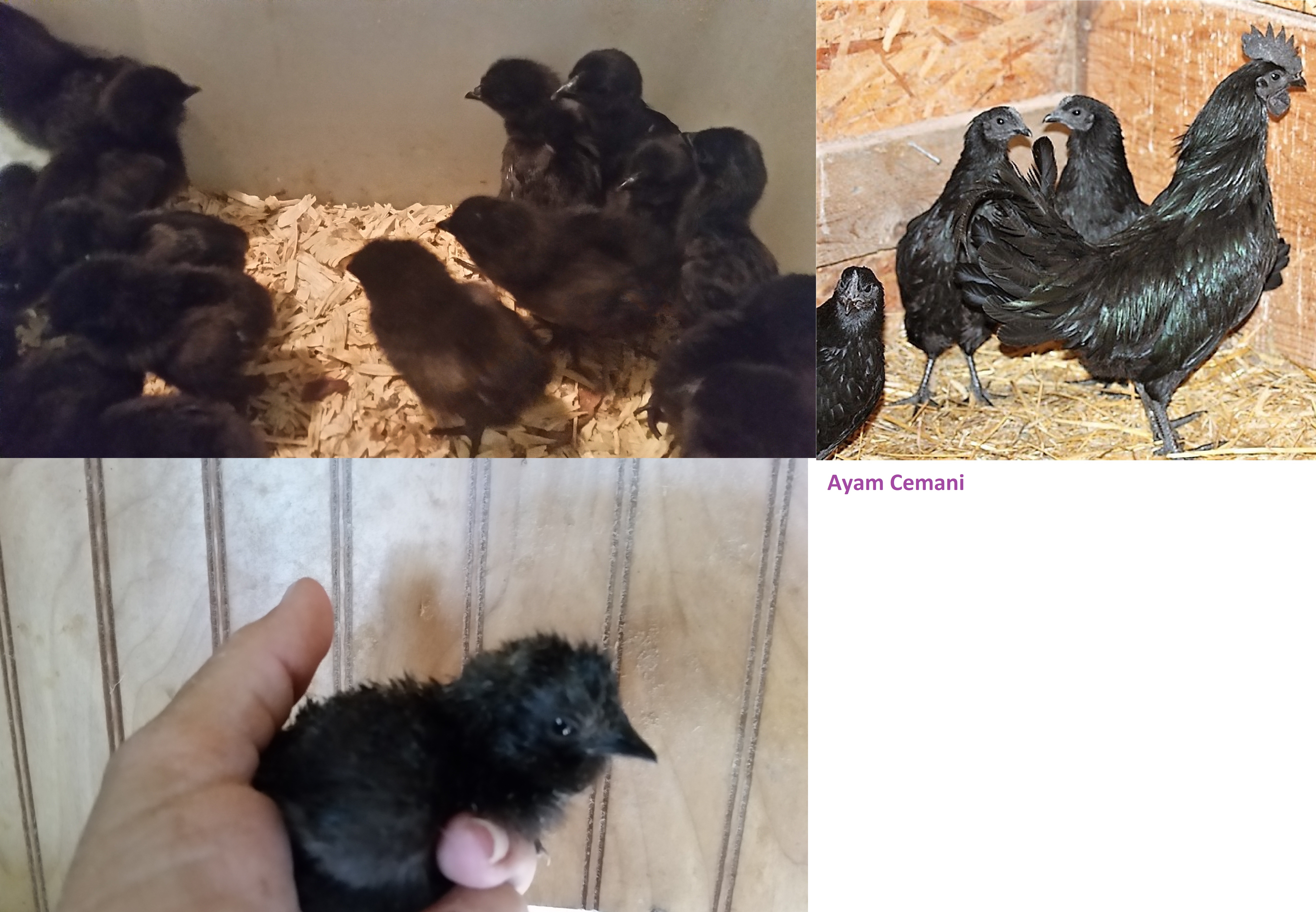andotte, Rhode Island Red, Ameraucana (colored egg layers), Barred Plymouth Rock, Black French Copper Maran, BB Red Bantam, & the ever so special Ayam Cemani (black inside & out chicken)